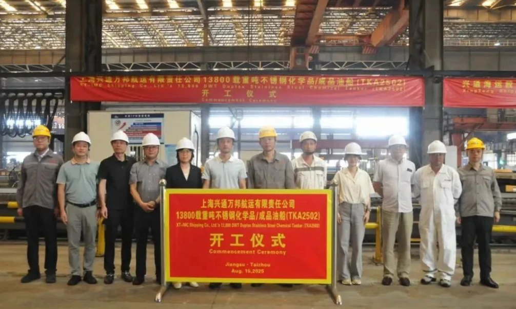 99979万彩网8月15日,上海兴通万邦航运有限责任公司与控股股东兴通海运股份有限公司在泰州口岸船舶有限公司共同举行2艘13000吨级不锈钢化学品船开工仪式。两艘船舶同步启动建造,充分体现了项目推进的高效节奏与双方团队的紧密协同能力。据悉,该批次剩余2艘船舶也将按计划有序开工。兴通股份副总裁陈其德、兴通万邦副总经理黄爱兰分别率团队出席仪式。